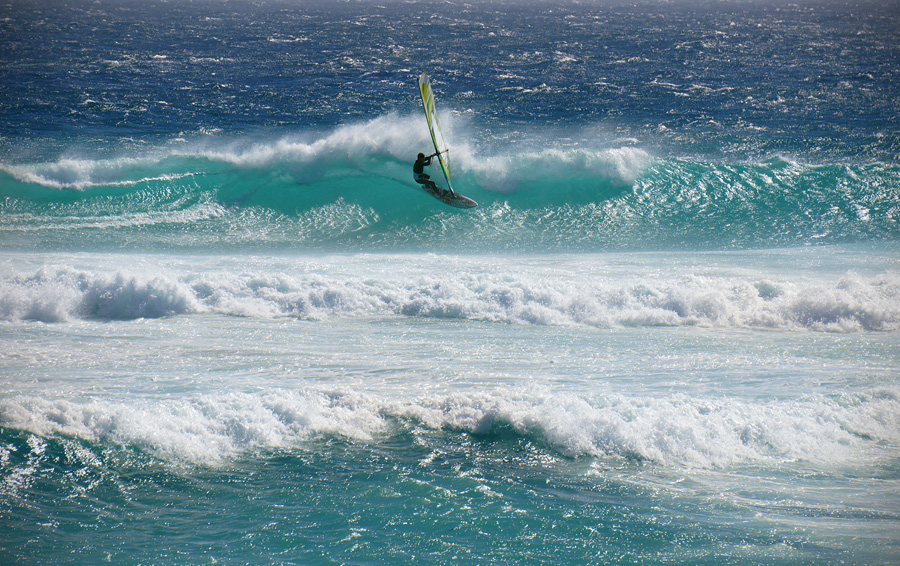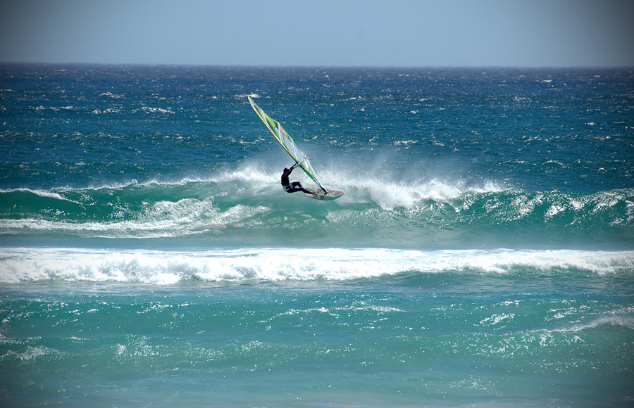 Pokud je vítr slabší vyrážíme do blízkosti Cape-pointu, kde fouká vždy o několik metrů víc a je zde mnoho rozmanitých spotů, které se velmi liší od míst na ježdění ve městě. Jsou to místa a pláže v divočině kde je často jen malé nebo žádné místo pro vstup do vody a břeh lemují skály a útesy, voda je studenější a četnost „velkých“ ryb pod vodou větší, ale pokud se to zde vydaří , je to zážitek na celý život. Letos jsme měli jeden takový den přímo na Cape-pointu na pláži Platboom. Dále po větru dolu jsou spoty Scarborow a Witsands – kde se jezdí i na severozápadní vítr na starboard (vítr zprava). Při tomto směru větru se zde dělají veliké vlny s dlouhou periodou a spolu s hodně offshore větrem to znamená skvělý riding .
